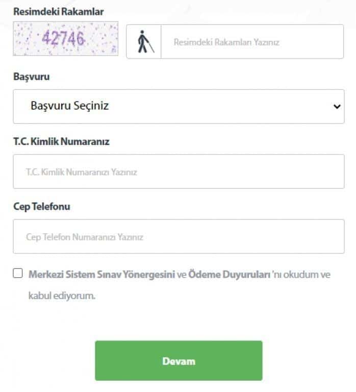 3.ADIM: Resimde karşınıza çıkan rakamları giriniz (Resimdeki örnek rakamlardır, sizin karşınıza farklı rakamlar çıkar). T.C. Kimlik Numaranızı giriniz. Cep Telefonunuzu giriniz. "Merkezi Sistem Sınav Yönergesini okudum ve kabul ediyorum." seçeneğini işaretleyiniz ve “Devam” butonuna tıklayınız. |