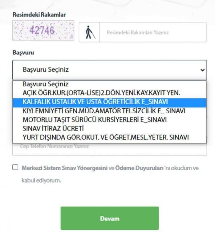 2.ADIM: Başvuru kısmından "kalfalık ustalık ve usta öğreticilik e-sınavı" seçiniz. |