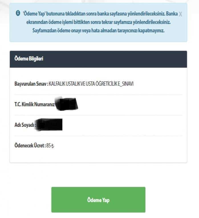 Atmlerden, mobil bankacılıktan veya odeme.meb.gov.tr adresi üzerinden kalfalık/ustalık ve usta öğreticilik e-sınav ücretini aşağıdaki adımları takip ederek yatırabilirsiniz.